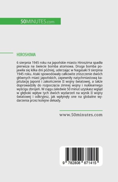 6 sierpnia 1945 roku na japo¿skie miasto Hiroszima spad¿a pierwsza na ¿wiecie bomba atomowa. Druga bomba pojawi¿a si¿ kilka dni pó¿niej, uderzaj¿c w Nagasaki 9 sierpnia 1945 roku. Ataki spowodowäy cäkowite zniszczenie dwóch g¿ównych miast japo¿skich, zapewni¿y natychmiastow¿ kapitulacj¿ Japonii i zako¿czenie II wojny ¿wiatowej, a tak¿e doprowadzi¿y do rozpocz¿cia zimnej wojny i nuklearnego wy¿cigu zbroje¿. W ci¿gu zaledwie 50 minut uzyskasz wgl¿d w g¿¿boki wp¿yw tych dwóch wydarze¿ na wynik II wojny ¿wiatowej i odkryjesz, jak wp¿yn¿¿y one na globalne wydarzenia przez kolejne dekady. Ta prosta i pouczaj¿ca ksi¿¿ka zawiera dok¿adne omówienie kluczowych momentów bombardowania atomowego Japonii, w tym odkrycia rozszczepienia j¿dra atomowego, rozwoju broni atomowej i zrzucenia bomby. Zawiera równie¿ pe¿n¿ biografi¿ kluczowych postaci zaangäowanych w bombardowanie, w tym prezydenta USA Harry'ego Trumana, cenne wprowadzenie do kontekstu politycznego i ocen¿ konsekwencji pierwszej bomby atomowej, daj¿c ci wszystkie niezb¿dne informacje na temat tego strasznego rozdziäu wspó¿czesnej historii.