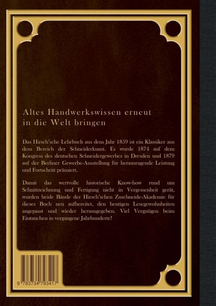 Altes Handwerkswissen erneuert in die Welt bringenDas Hirsch'sche Lehrbuch aus dem Jahr 1859 ist ein Klassiker aus dem Bereich der Schneiderkunst. Es wurde 1874 auf dem Kongress des deutschen Schneidergewerbes in Dresden und 1879 auf der Berliner Gewerbe-Ausstellung für herausragende Leistung und Fortschritt prämiert.Damit das wertvolle historische Know-how rund um Schnittzeichnung und Fertigung nicht in Vergessenheit gerät, wurden beide Bände der Hirsch'schen Zuschneide-Akademie für dieses Buch neu aufbereitet, den heutigen Lesegewohnheiten angepasst und wieder herausgegeben. Viel Vergnügen beim Eintauchen in vergangene Jahrhunderte!