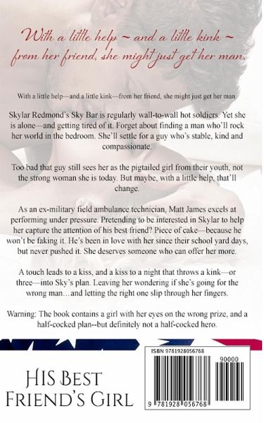With a little help—and a little kink—from her friend, she might just get her man. Skylar Redmond’s Sky Bar is regularly wall-to-wall hot soldiers. Yet she is alone—and getting tired of it. Forget about finding a man who’ll rock her world in the bedroom. She’ll settle for a guy who’s stable, kind and compassionate. Too bad that guy still sees her as the pigtailed girl from their youth, not the strong woman she is today. But maybe, with a little help, that’ll change. As an ex-military field ambulance technician, Matt James excels at performing under pressure. Pretending to be interested in Skylar to help her capture the attention of his best friend? Piece of cake—because he won’t be faking it. He’s been in love with her since their school yard days, but never pushed it. She deserves someone who can offer her more. A touch leads to a kiss, and a kiss to a night that throws a kink—or three—into Sky’s plan. Leaving her wondering if she’s going for the wrong man…and letting the right one slip through her fingers. Warning: The book contains a girl with her eyes on the wrong prize, and a half-cocked plan--but definitely not a half-cocked hero. Each book in the Line of Duty Series can be read as a Standalone.