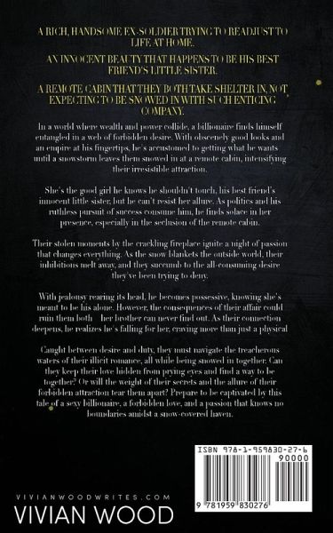 From Wall Street Journal and USA Today bestselling author Vivian Wood comes a new billionaire best friend's little sister romance. Fans of The Stopover by TL Swan, The Fine Printby Lauren Asher, and My Dark Romeo by Parker S. Huntington and LJ Shen will love this book. A rich, handsome ex-soldier trying to readjust to life at home. An innocent beauty that happens to be his best friend's little sister. A remote cabin that they both take shelter in, not expecting to be snowed in with such enticing company. In a world where wealth and power collide, a billionaire finds himself entangled in a web of forbidden desire. With obscenely good looks and an empire at his fingertips, he's accustomed to getting what he wants - until a snowstorm leaves them snowed in at a remote cabin, intensifying their irresistible attraction. She's the good girl he knows he shouldn't touch, his best friend's innocent little sister, but he can't resist her allure. As politics and his ruthless pursuit of success consume him, he finds solace in her presence, especially in the seclusion of the remote cabin. Their stolen moments by the crackling fireplace ignite a night of passion that changes everything. As the snow blankets the outside world, their inhibitions melt away, and they succumb to the all-consuming desire they've been trying to deny. With jealousy rearing its head, he becomes possessive, knowing she's meant to be his alone. However, the consequences of their affair could ruin them both - her brother can never find out. As their connection deepens, he realizes he's falling for her, craving more than just a physical connection. Caught between desire and duty, they must navigate the treacherous waters of their illicit romance, all while being snowed in together. Can they keep their love hidden from prying eyes and find a way to be together? Or will the weight of their secrets and the allure of their forbidden attraction tear them apart? Prepare to be captivated by this tale of a sexy billionaire, a forbidden love, and a passion that knows no boundaries amidst a snow-covered haven.