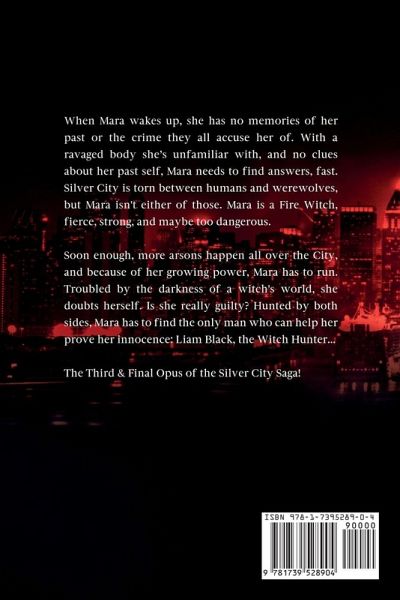 She is no one. When Mara wakes up, she has no memories of her past or the crime they all accuse her of. With a ravaged body she's unfamiliar with, and no clues about her past self, Mara needs to find answers, fast. Silver City is torn between humans and werewolves, but Mara isn't either of those. Mara is a Fire Witch, fierce, strong, and maybe too dangerous. Soon enough, more arsons happen all over the City, and because of her growing power, Mara has to run. Troubled by the darkness of a witch's world, she doubts herself. Is she really guilty? Hunted by both sides, Mara has to find the only man who can help her prove her innocence: Liam Black, the Witch Hunter...