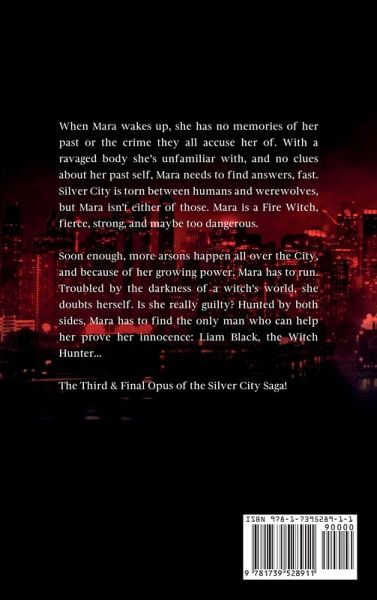 She is no one. When Mara wakes up, she has no memories of her past or the crime they all accuse her of. With a ravaged body she's unfamiliar with, and no clues about her past self, Mara needs to find answers, fast. Silver City is torn between humans and werewolves, but Mara isn't either of those. Mara is a Fire Witch, fierce, strong, and maybe too dangerous. Soon enough, more arsons happen all over the City, and because of her growing power, Mara has to run. Troubled by the darkness of a witch's world, she doubts herself. Is she really guilty? Hunted by both sides, Mara has to find the only man who can help her prove her innocence: Liam Black, the Witch Hunter...