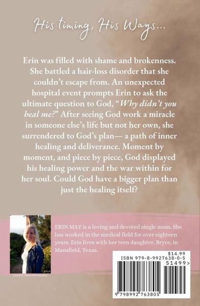 Discover a Story of Faith, Healing, and Surrender... In His Choosing, Erin May takes you on an intimate journey through pain, perseverance, and divine purpose. Battling a relentless hair-loss disorder and haunted by shame and brokenness, Erin finds herself questioning God-"Why didn't you heal me?" But when a miraculous healing touches someone else's life, Erin is faced with a choice: cling to bitterness or surrender to God's greater plan. What follows is a powerful testimony of inner healing, trust, and the quiet work of a faithful God who restores piece by piece. This moving account will encourage anyone waiting for their breakthrough to see that sometimes, the healing God offers is deeper than we imagined. Written by Erin May, this book is a must-read for anyone navigating unanswered prayers and seeking hope in the silence.