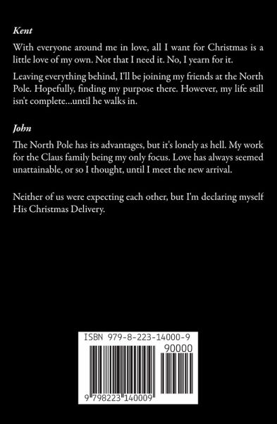 Kent With everyone around me in love, all I want for Christmas is a little love of my own. Not that I need it. No, I yearn for it. Leaving everything behind, I'll be joining my friends at the North Pole. Hopefully, finding my purpose there. However, my life still isn't complete…until he walks in. John The North Pole has its advantages, but it's lonely as hell. My work for the Claus family being my only focus. Love has always seemed unattainable, or so I thought, until I meet the new arrival. Neither of us were expecting each other, but I'm declaring myself His Christmas Delivery.