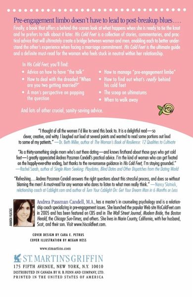 Finally, a book that offers a behind-the-scenes look at what happens when she is ready to tie the knot and he prefers to talk about it later. His Cold Feet is a collection of stories, commentaries, and practical advice that will ultimately create a bridge between women and men, enabling each to better understand the other's experience when facing a marriage commitment. His Cold Feet is the ultimate guide and a definite must-read for the woman who feels stuck in neutral within her relationship. In His Cold Feet, you'll find: . Advice on how to have "the talk" . How to deal with the dreaded "When are you two getting married?" . The scoop on ultimatums . A man's perspective on popping the question . How to manage "pre-engagement limbo" . How to find out what's really behind his cold feet . When to walk away And lots of other crucial, sanity-saving advice.