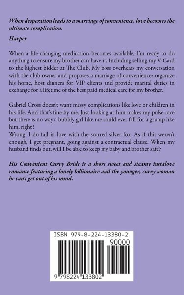 When desperation leads to a marriage of convenience, love becomes the ultimate complication. Harper When a life-changing medication becomes available, I'm ready to do anything to ensure my brother can have it. Including selling my V-Card to the highest bidder at The Club. My boss overhears my conversation with the club owner and proposes a marriage of convenience: organize his home, host dinners for VIP clients and provide marital duties in exchange for a lifetime of the best paid medical care for my brother. Gabriel Cross doesn't want messy complications like love or children in his life. And that's fine by me. Just looking at him makes my pulse race but there is no way a bubbly girl like me could ever fall for a grump like him, right? Wrong. I do fall in love with the scarred silver fox. As if this weren't enough, I get pregnant, going against a contractual clause. When my husband finds out, will I be able to keep my baby and brother safe? His Convenient Curvy Bride is a short sweet and steamy instalove romance featuring a lonely billionaire and the younger, curvy woman he can't get out of his mind.