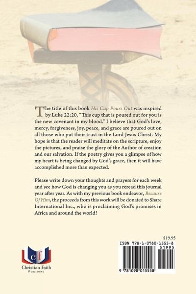 The title of this book His Cup Pours Out was inspired by Luke 22:20, "This cup that is poured out for you is the new covenant in my blood." I believe that God's love, mercy, forgiveness, joy, peace, and grace are poured out on all those who put their trust in the Lord Jesus Christ. My hope is that the reader will meditate on the scripture, enjoy the pictures, and praise the glory of the Author of creation and our salvation. If the poetry gives you a glimpse of how my heart is being changed by God's grace, then it will have accomplished more than expected. Please write down your thoughts and prayers for each week and see how God is changing you as you reread this journal year after year. As with my previous book endeavor, Because Of Him, the proceeds from this work will be donated to Share International Inc., who is proclaiming God's promises in Africa and around the world!