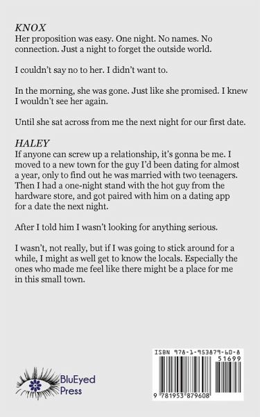 Knox Her proposition was easy. One night. No names. No connection. Just a night to forget the outside world. I couldn't say no to her. I didn't want to. In the morning, she was gone. Just like she promised. I knew I wouldn't see her again. Until she sat across from me the next night for our first date. Haley If anyone can screw up a relationship, it's gonna be me. I moved to a new town for the guy I'd been dating for almost a year, only to find out he was married with two teenagers. Then I had a one-night stand with the hot guy from the hardware store, and got paired with him on a dating app for a date the next night. After I told him I wasn't looking for anything serious. I wasn't, not really, but if I was going to stick around for a while, I might as well get to know the locals. Especially the ones who made me feel like there might be a place for me in this small town.