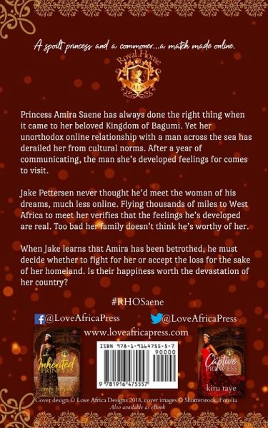 Princess Amira Saene has always done the right thing when it came to her beloved Kingdom of Bagumi. Yet her unorthodox online relationship with a man across the sea has derailed her from cultural norms. After a year of communicating, the man she's developed feelings for comes to visit. Jake Pettersen never thought he'd meet the woman of his dreams, much less online. Flying thousands of miles to West Africa to meet her verifies that the feelings he's developed are real. Too bad her family doesn't think he's worthy of her. When Jake learns that Amira has been betrothed, he must decide whether to fight for her or accept the loss for the sake of her homeland. Is their happiness worth the devastation of her country?