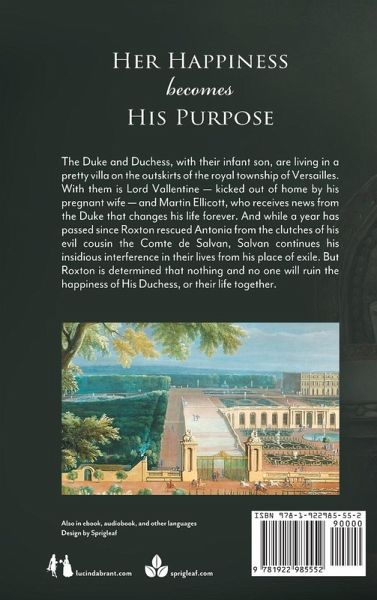 The Duke and Duchess, with their infant son, are living in a pretty villa on the outskirts of the royal township of Versailles, preparing for Antonia's court presentation. With them is Lord Vallentine-kicked out of home by his pregnant wife-and Martin Ellicott, who receives news from the Duke that changes his life forever. And while a year has passed since Roxton rescued Antonia from the clutches of his evil cousin the Comte de Salvan, Salvan continues his insidious interference in their lives from his place of exile, and with the collusion of the Salvan ancient aunts. But Roxton is determined that nothing and no one will ruin the happiness of His Duchess, or their life together.