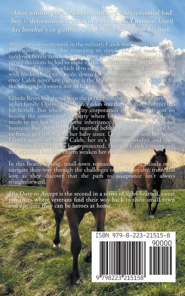 After winning medals in the military, this reformed bad boy is determined to walk the straight and narrow. Until his brother's ex girlfriend winds her way down his path. After years of covert work in the military, Caleb Starr arrives back in his hometown, hoping that returning to simple life and work on his rundown family ranch will wipe away the memories of some of his less savory decisions he had to make in the heat of combat. Surprisingly, his first crucial decision, which is to enter into a marriage of convenience with his brother's ex-fiancée, doesn't win him any favors. The tactical error Caleb never saw coming is the feelings that sneak up on him for the woman he's sworn not to fall for. Glinda Reyes has always been the perfect daughter, sister, and caretaker in her family. Opening her beauty salon was the first thing she ever did for herself. But when a big city corporation enters town intent on buying the commercial property where her business is housed, she needs to get her hands on the inheritance her father left to save her business. But she needs to be married before she can access it and her ex-fiancé just left her for her baby sister. Desperate to save her salon, Glinda agrees to marry Caleb, her ex's younger brother and she's determined to keep her heart protected. But will Caleb's strong will and reformed bad boy charm weaken her resolve? In this heartwarming, small-town romance, Caleb and Glinda must navigate their way through the challenges of family loyalty, trust, and love as they discover that the path to acceptance isn't always straightforward. His Duty to Accept is the second in a series of light-hearted, sweet romances where veterans find their way back to their small town and discover they can be heroes at home.