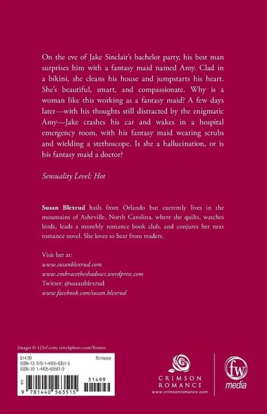 On the eve of Jake Sinclair's bachelor party, his best man surprises him with a fantasy maid named Amy. Clad in a bikini, she cleans his house and jump starts his heart. She's beautiful, smart, and compassionate. Why is a woman like this working as a fantasy maid? A few days later, his thoughts still distracted by the enigmatic Amy, Jake crashes his car and wakes in the hospital emergency room where his fantasy maid is now wearing scrubs and wielding a stethoscope. Is she a hallucination, or is his fantasy maid a doctor? Sensuality Level: Hot