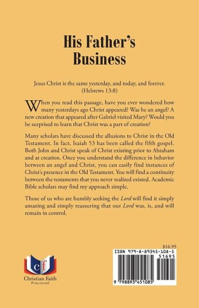 Jesus Christ is the same yesterday, and today, and forever. (Hebrews 13:8) When you read this passage, have you ever wondered how many yesterdays ago Christ appeared? Was he an angel? A new creation that appeared after Gabriel visited Mary? Would you be surprised to learn that Christ was a part of creation? Many scholars have discussed the allusions to Christ in the Old Testament. In fact, Isaiah 53 has been called the fifth gospel. Both John and Christ speak of Christ existing prior to Abraham and at creation. Once you understand the difference in behavior between an angel and Christ, you can easily find instances of Christ's presence in the Old Testament. You will find a continuity between the testaments that you never realized existed. Academic Bible scholars may find my approach simple. Those of us who are humbly seeking the Lord will find it simply amazing and simply reassuring that our Lord was, is, and will remain in control.