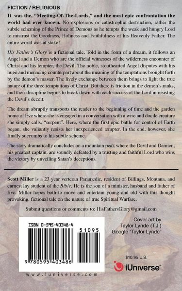 It was the, "Meeting-Of-The-Lords," and the most epic confrontation the world had ever known. No explosions or catastrophic destruction, rather the subtle scheming of the Prince of Demons as he tempts the weak and hungry Lord to mistrust the Goodness, Holiness and Faithfulness of his Heavenly Father. The entire world was at stake! His Father's Glory is a fictional tale. Told in the form of a dream, it follows an Angel and a Demon who are the official witnesses of the wilderness encounter of Christ and his tempter, the Devil. The noble, stouthearted Angel disputes with his huge and menacing counterpart about the meaning of the temptations brought forth by the demon's master. The lively exchange between them brings to light the true nature of the three temptations of Christ. But there is friction in the demon's ranks, and their discipline begins to break down with each success of the Lord in resisting the Devil's deceit. The dream abruptly transports the reader to the beginning of time and the garden home of Eve where she is engaged in a conversation with a wise and docile creature she simply calls, "serpent". Here, where the first epic battle for control of Earth began, she valiantly resists her inexperienced tempter. In the end, however, she finally succumbs to his subtle scheme. The story dramatically concludes on a mountain peak where the Devil and Damien, his greatest captain, are soundly defeated by a trusting and faithful Lord who wins the victory by unveiling Satan's deceptions.