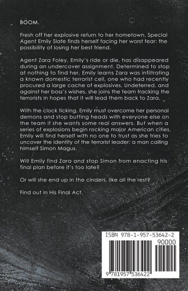 Boom. Fresh off her explosive return to her hometown, Special Agent Emily Slate finds herself facing her worst fear: the possibility of losing her best friend. Agent Zara Foley, Emily's ride or die, has disappeared during an undercover assignment. Determined to stop at nothing to find her, Emily learns Zara was infiltrating a known domestic terrorist cell, one who had recently procured a large cache of explosives. Undeterred, and against her boss's wishes, she joins the team tracking the terrorists in hopes that it will lead them back to Zara. With the clock ticking, Emily must overcome her personal demons and stop butting heads with everyone else on the team if she wants some real answers. But when a series of explosions begin rocking major American cities, Emily will find herself with no one to trust as she tries to uncover the identity of the terrorist leader: a man calling himself Simon Magus. Will Emily find Zara and stop Simon from enacting his final plan before it's too late? Or will she end up in the cinders, like all the rest? Find out in His Final Act.