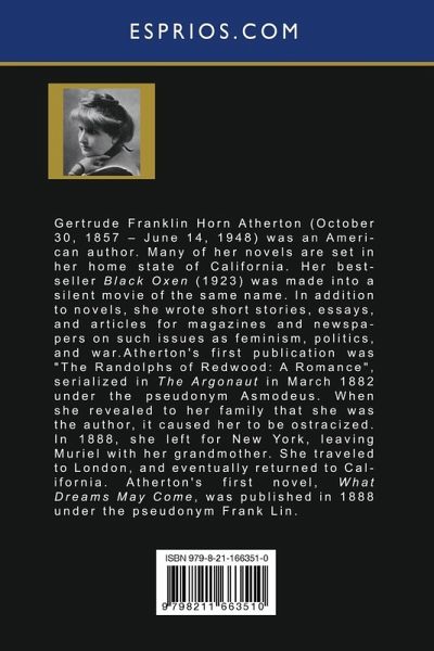 Gertrude Franklin Horn Atherton (October 30, 1857 - June 14, 1948) was an American author. Many of her novels are set in her home state of California. Her bestseller Black Oxen (1923) was made into a silent movie of the same name. In addition to novels, she wrote short stories, essays, and articles for magazines and newspapers on such issues as feminism, politics, and war. Atherton's first publication was "The Randolphs of Redwood: A Romance", serialized in The Argonaut in March 1882 under the pseudonym Asmodeus. When she revealed to her family that she was the author, it caused her to be ostracized. In 1888, she left for New York, leaving Muriel with her grandmother. She traveled to London, and eventually returned to California. Atherton's first novel, What Dreams May Come, was published in 1888 under the pseudonym Frank Lin.