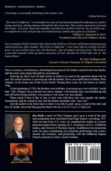 This is a serious, yet humorous, chronological account of Jim Diehl's search for his true family, and the many turns along that path he encountered. Growing up, there were no baby books or relatives to answer his questions about who he was. His earliest memory is growing up with his brother, Steve, on a small farm in Milton, West Virginia, in the foster care of the Lewis family. During those years, he was known as Jimmy Ying. At the beginning of 1956, the brothers were told they were going on a visit with their "social lady," Mrs. Morgan. On a cold and very snowy January 11th morning, they were bundled up and sent off before being told they were going to visit some very nice people. When asked if they'd like to stay or just visit with these new nice people, the author immediately said he wanted to stay, but his brother hesitantly said, "just visit." Join the author as he looks back at what it was like to grow up as a ward of the state and how he finally answered that question about who he is in His Grace Is Sufficient.