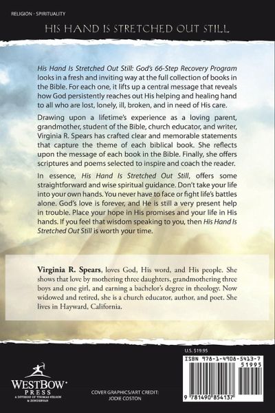 His Hand Is Stretched Out Still: God¿s 66-Step Recovery Program looks in a fresh and inviting way at the full collection of books in the Bible. For each one, it lifts up a central message that reveals how God persistently reaches out His helping and healing hand to all who are lost, lonely, ill, broken, and in need of His care. Drawing upon a lifetime¿s experience as a loving parent, grandmother, student of the Bible, church educator, and writer, Virginia R. Spears has crafted clear and memorable statements that capture the theme of each biblical book. She reflects upon the message of each book in the Bible. Finally, she offers scriptures and poems selected to inspire and coach the reader. In essence, His Hand Is Stretched Out Still, offers some straightforward and wise spiritual guidance. Don¿t take your life into your own hands. You never have to face or ?ght life¿s battles alone. God¿s love is forever, and He is still a very present help in trouble. Place your hope in His promises and your life in His hands. If you feel that wisdom speaking to you, then His Hand Is Stretched Out Still is worth your time.
