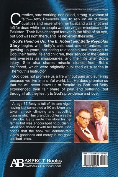 Creative, hard working, dedicated, strong, a woman of faith-Betty Reynolds had to rely on all of these qualities and more when her husband was shot and left for dead while the couple was serving as missionaries in Pakistan. Their lives changed forever in the blink of an eye, but God was right there, and He never left their side. God's Hand on Us: The E. Robert and Betty Reynolds Story begins with Betty's childhood and chronicles her growing up years, her dating relationship and marriage to Bob, their family life and children, their service in the States and overseas as missionaries, and their life after Bob's injury. She also shares miracle stories from Bob's childhood, which were originally published as a series in The Youth's Instructor. God does not promise us a life without pain and suffering because we live in a sinful world, but He does promise us that He will never leave us or forsake us. Bob and Betty experienced their fair share of pain and suffering, but through it all, they testify to God's providence and love.
