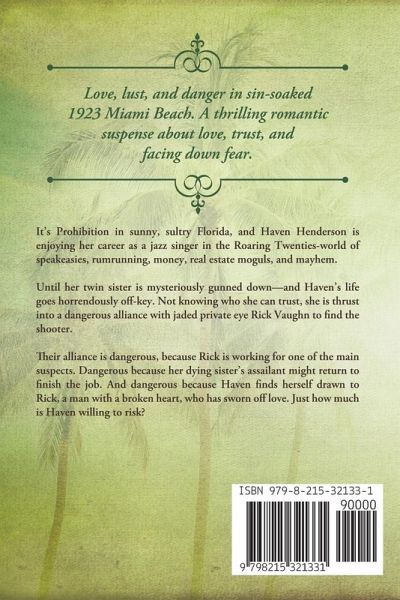 Love, lust, and danger in sin-soaked 1923 Miami Beach. A thrilling romantic suspense about love, trust, and facing down fear. It's Prohibition in sunny, sultry Florida, and Haven Henderson is enjoying her career as a jazz singer in the Roaring Twenties-world of speakeasies, rumrunning, money, real estate moguls, and mayhem. Until her twin sister is mysteriously gunned down-and Haven's life goes horrendously off-key. Not knowing who she can trust, she is thrust into a dangerous alliance with jaded private eye Rick Vaughn to find the shooter. Their alliance is dangerous, because Rick is working for one of the main suspects. Dangerous because her dying sister's assailant might return to finish the job. And dangerous because Haven finds herself drawn to Rick, a man with a broken heart, who has sworn off love. Just how much is Haven willing to risk?
