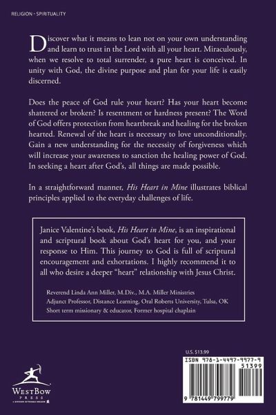 Discover what it means to lean not on your own understanding and learn to trust in the Lord with all your heart. Miraculously, when we resolve to total surrender, a pure heart is conceived. In unity with God, the divine purpose and plan for your life is easily discerned. Does the peace of God rule your heart? Has your heart become shattered or broken? Is resentment or hardness present? The Word of God offers protection from heartbreak and healing for the broken hearted. Renewal of the heart is necessary to love unconditionally. Gain a new understanding for the necessity of forgiveness which will increase your awareness to sanction the healing power of God. In seeking a heart after God's, all things are made possible. In a straightforward manner, His Heart in Mine illustrates biblical principles applied to the everyday challenges of life.