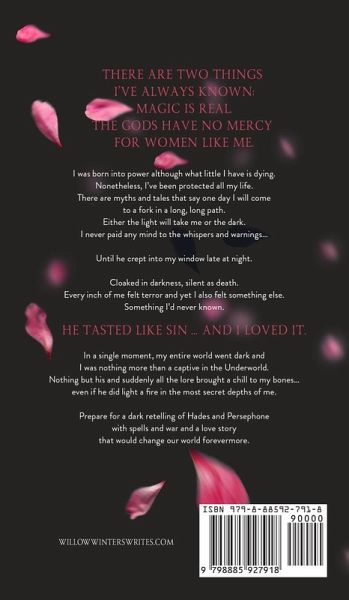 There are two things I've always known: Magic is real. The Gods have no mercy for women like me. I was born into power although what little I have is dying. Nonetheless, I've been protected all my life. There are myths and tales that say one day I will come to a fork in a long, long path. Either the light will take me or the dark. I never paid any mind to the whispers and warnings... Until he crept into my window late at night. Cloaked in darkness, silent as death. Every inch of me felt terror and yet I also felt something else. Something I'd never known. He tasted like sin ... and I loved it. In a single moment, my entire world went dark and I was nothing more than a captive in the Underworld. Nothing but his and suddenly all the lore brought a chill to my bones... even if he did light a fire in the most secret depths of me. Prepare for a dark retelling of Hades and Persephone with spells and war and a love story that would change our world forevermore.