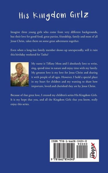 Imagine three young girls who come from very different backgrounds, but their love for good food, great parties, friendship, family and most of all Jesus Christ, takes them on some great adventures together. Even when a long-lost family member shows up unexpectedly, will it ruin this birthday weekend for Tasha? My name is Tiffany Moss and I absolutely love to write, sing, spend time in nature and enjoy time with my family. My greatest love is my love for Jesus Christ and sharing it with people of all ages. However, I hold a special place in my heart for children and my wanting to share how important, loved and cherished they are by Jesus Christ. Because of that great love, I created my children's series His Kingdom Girlz. It is my hope that you, and all the Kingdom Girlz that you know, really enjoy this series.