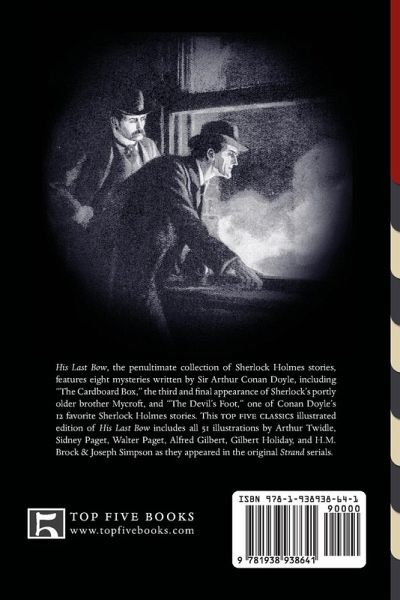 His Last Bow, the penultimate collection of Sherlock Holmes stories, features eight mysteries written by Sir Arthur Conan Doyle, including "The Cardboard Box," the third and final appearance of Sherlock's portly older brother Mycroft, and "The Devil's Foot," one of Conan Doyle's 12 favorite Sherlock Holmes stories. This Top Five Classics illustrated edition of His Last Bow includes all 51 illustrations by Arthur Twidle, Sidney Paget, Walter Paget, Alfred Gilbert, Gilbert Holiday, and H.M. Brock & Joseph Simpson as they appeared in the original Strand serials.
