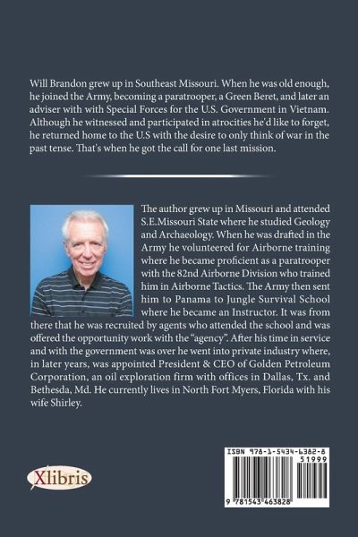 Will Brandon grew up in Southeast Missouri. When he was old enough, he joined the Army, becoming a paratrooper, a Green Beret, and later an adviser with with Special Forces for the U.S. Government in Vietnam. Although he witnessed and participated in atrocities he'd like to forget, he returned home to the U.S with the desire to only think of war in the past tense. That's when he got the call for one last mission.
