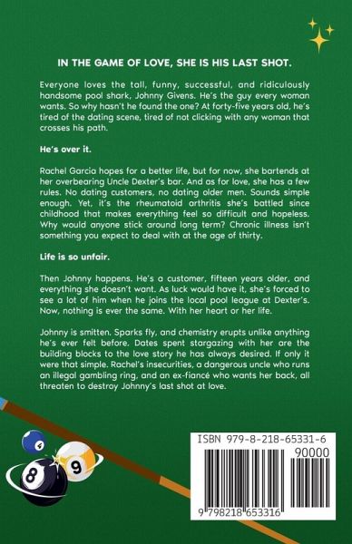 In the game of love, she is HIS LAST SHOT. Everyone loves the tall, funny, successful, and ridiculously handsome pool shark, Johnny Givens. He's the guy every woman wants. So why hasn't he found the one? At forty-five years old, he's tired of the dating scene, tired of not clicking with any woman that crosses his path. He's over it. Rachel Garcia hopes for a better life, but for now, she bartends at her overbearing Uncle Dexter's bar. And as for love, she has a few rules. No dating customers, no dating older men. Sounds simple enough. Yet, it's the rheumatoid arthritis she's battled since childhood that makes everything feel so difficult and hopeless. Why would anyone stick around long term? Chronic illness isn't something you expect to deal with at the age of thirty. Life is so unfair. Then Johnny happens. He's a customer, fifteen years older, and everything she doesn't want. As luck would have it, she's forced to see a lot of him when he joins the local pool league at Dexter's. Now, nothing is ever the same. With her heart or her life. Johnny is smitten. Sparks fly, and chemistry erupts unlike anything he's ever felt before. Dates spent stargazing with her are the building blocks to the love story he has always desired. If only it were that simple. Rachel's insecurities, a dangerous uncle who runs an illegal gambling ring, and an ex-fiancé who wants her back, all threaten to destroy Johnny's last shot at love.