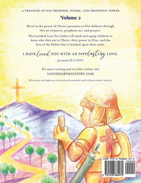 A treasury of His promises, poems, and prophetic power. Revel in the power of Christ's promises to His children through this set of poetry, prophetic art, and prayers. His Lavished Love for Littles will teach and equip children to know who they are in Christ, their power in Him, and the love of the Father that is lavished upon their souls. "I have loved you with an everlasting love." Jeremiah 31:3 (NIV) For more writing and to order online visit lionheartministry.com. All content and rights are reserved and cannot be used without written consent.