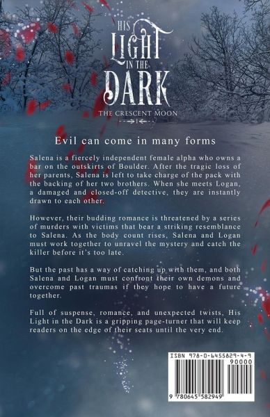 His Light in the Dark Evil can come in many forms. Salena is a fiercely independent female alpha who owns a bar on the outskirts of Boulder. After the tragic loss of her parents, Salena is left to take charge of the pack with the backing of her two brothers. When she meets Logan, a damaged and closed-off detective, they are instantly drawn to each other. However, their budding romance is threatened by a series of murders with victims that bear a striking resemblance to Salena. As the body count rises, Salena and Logan must work together to unravel the mystery and catch the killer before it's too late. But the past has a way of catching up with them, and both Salena and Logan must confront their own demons and overcome past traumas if they hope to have a future together. Full of suspense, romance, and unexpected twists, His Light in the Dark is a gripping page-turner that will keep readers on the edge of their seats until the very end.
