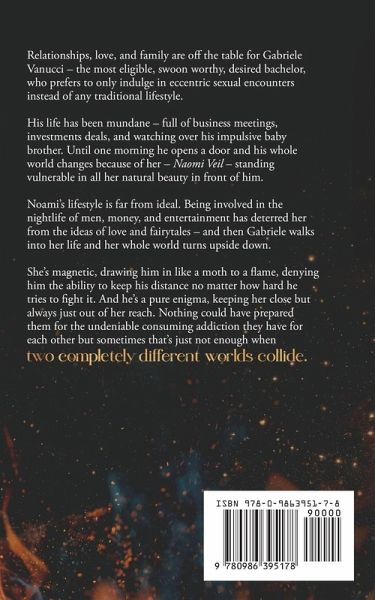 Relationships, love, and family are off the table for Gabriele Vanucci - the most eligible, swoon worthy, desired bachelor, who prefers to only indulge in eccentric sexual encounters instead of any traditional lifestyle. His life has been mundane - full of business meetings, investments deals, and watching over his impulsive baby brother. Until one morning he opens a door and his whole world changes because of her- Naomi Veil - standing vulnerable in all her natural beauty in front of him. Noami's lifestyle is far from ideal. Being involved in the nightlife of men, money, and entertainment has deterred her from the ideas of love and fairytales - and then Gabriele walks into her life and her whole world turns upside down. She's magnetic, drawing him in like a moth to a flame, denying him the ability to keep his distance no matter how hard he tries to fight it. And he's a pure enigma, keeping her close but always just out of her reach. Nothing could have prepared them for the undeniable consuming addiction they have for each other but sometimes that's just not enough when two completely different worlds collide.