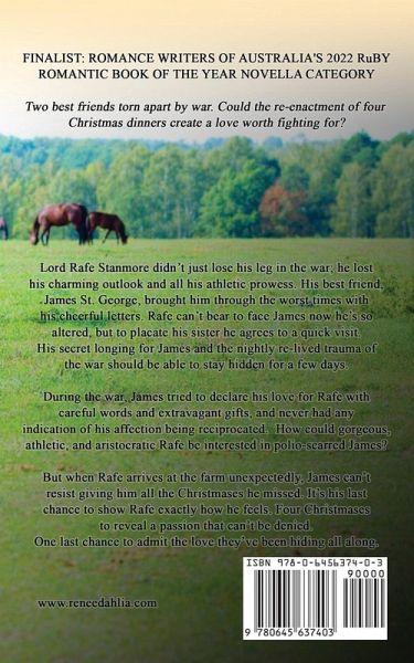 FINALIST: ROMANCE WRITERS OF AUSTRALIA'S 2022 RuBY - ROMANTIC BOOK OF THE YEAR - NOVELLA CATEGORY Two best friends torn apart by war. Could the re-enactment of four Christmas dinners create a love worth fighting for? Lord Rafe Stanmore didn't just lose his leg in the war; he lost his charming outlook and all his athletic prowess. His best friend, James St. George, brought him through the worst times with his cheerful letters. Rafe can't bear to face James now he's so altered, but to placate his sister he agrees to a quick visit. His secret longing for James and the nightly re-lived trauma of the war should be able to stay hidden for a few days. During the war, James tried to declare his love for Rafe with careful words and extravagant gifts, and never had any indication of his affection being reciprocated. How could gorgeous, athletic, and aristocratic Rafe be interested in polio scarred James? But when Rafe arrives at the farm unexpectedly, James can't resist giving him all the Christmases he missed. It's his last chance to show Rafe exactly how he feels. Four Christmases to reveal a passion that can't be denied. One last chance to admit the love they've been hiding all along.