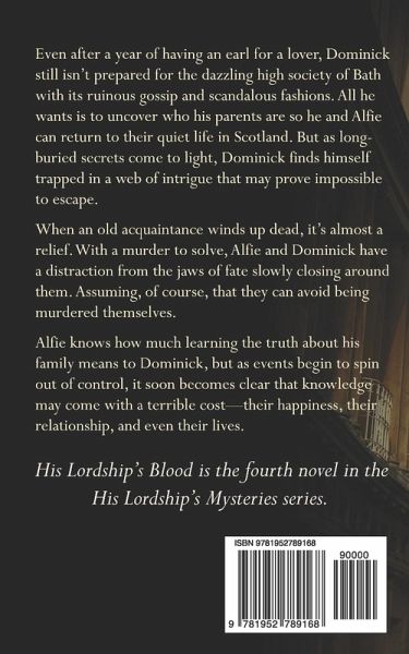 Even after a year of having an earl for a lover, Dominick still isn't prepared for the dazzling high society of Bath with its ruinous gossip and scandalous fashions. All he wants is to uncover who his parents are so he and Alfie can return to their quiet life in Scotland. But as long-buried secrets come to light, Dominick finds himself trapped in a web of intrigue that may prove impossible to escape. When an old acquaintance winds up dead, it's almost a relief. With a murder to solve, Alfie and Dominick have a distraction from the jaws of fate slowly closing around them. Assuming, of course, that they can avoid being murdered themselves. Alfie knows how much learning the truth about his family means to Dominick, but as events begin to spin out of control, it soon becomes clear that knowledge may come with a terrible cost-their happiness, their relationship, and even their lives. His Lordship's Blood is the fourth novel in the His Lordship's Mysteries series.