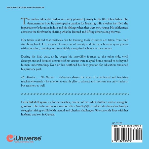 The author takes the readers on a very personal journey in the life of her father. She demonstrates how he developed a passion for learning. His mother instilled the importance of education in him and his siblings when they were very young. His selflessness comes to the forefront by sharing what he learned and lifting others along the way. Her father realized that obstacles can be learning tools if lessons are taken from each stumbling block. He navigated his way out of poverty and his name became synonymous with education, teaching and two highly recognized schools in the country. During his final days, as he began his incredible journey to the other side, vivid descriptions and detailed accounts of his visions were relayed. Some proved to be beyond human understanding. Even on his deathbed his deep passion for education remained his primary goal. His Mission … His Passion … Education shares the story of a dedicated and inspiring teacher who made it his mission to use his gifts to educate and motivate not only students, but teachers as well.