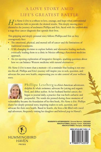 A Love Story Amid Life's Greatest Battle His Name is Eric is a tribute to love, courage, and hope when conventional medicine fails to provide the desired results. This deeply moving story chronicles the journey of soulmates Phillipa and Eric, faced with the unthinkable: a stage-four cancer diagnosis that upends their lives. This gripping and deeply personal story follows Phillipa and Eric as they courageously face:The emotional, physical, and mental toll of cancer and the limitations of traditional treatments. A life-changing decision to explore holistic and alternative healing methods, eventually leading them to a clinic in Mexico offering a functional medicine approach. An eye-opening exploration of integrative therapies, sparking questions about how we can balance Western medicine with natural alternatives. Hi Name is Eric is more than a memoir--it's a reminder that healing is not one-size-fits-all. Phillipa and Eric's journey will inspire you to seek, question, and advocate for your own health, empowering you to take control of your wellness story.