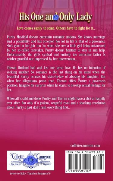 Love comes easily to some. Others have to fight for it... Purity Mayfield doesn't entertain romantic notions. She knows marriage isn't a possibility and has accepted her lot in life is that of a governess. She's good at her job, too. So, when she sees a little girl being mistreated by her so-called caretaker, Purity doesn't hesitate to step in and help. Unfortunately, the girl's cynical and entirely too attractive father is neither grateful nor impressed by her intervention... Theran Rutland had-and lost-one great love. He has no intention of seeking another. So, romance is the last thing on his mind when the beautiful Purity accuses his sister-in-law of abusing his daughter. But when her allegations prove true, Theran offers Purity a governess position. Imagine his surprise when he starts to develop actual feelings for her... When all is said and done, Purity and Theran might have a shot at happily ever after. But only if a jealous, vengeful rival and a shocking revelation about Purity's past don't ruin everything first... ~ * ~ Secrets, scandals, and sigh-worthy romance. This sweet, wholesome historical romance by a USA Today bestselling author will have you sighing as you escape into the past to cheer Purity and Theran on to their much-deserved happily-ever-after. If you enjoy reading lovable rogues, spinster, class differences, and opposites attract clean historical romances with a pinch of mystery and inspiration, a dash of humor, and soul-searing emotion, then you'll adore Collette Cameron's captivating DAUGHTERS OF DESIRE: SCANDALOUS LADIES series. Settle into a comfy reading nook with your favorite beverage for a page-turning, entertaining Regency world adventure you can't put down. Though this book can easily be read as a stand-alone, most readers prefer to read the series in order. DAUGHTERS OF DESIRE: A Lady, A Kiss, A Christmas Wish No Lady for the Lord Love Lessons for a Lady His One and Only Lady Never a Proper Lady Lady Tempts a Rogue CHECK OUT COLLETTE'S OTHER SERIES: Chronicles of the Westbrook Brides Daughters of Disgrace: Secrets of Scandalous Ladies Dukes Come Calling Heart of a Scot For the Love of an Earl (Wicked Earls' Club) Ladies of Opportunity The Culpepper Misses The Honorable Rogues®