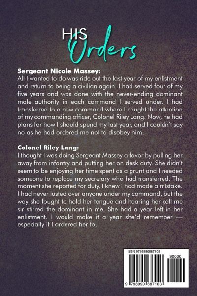 Sergeant Nicole Massey: All I wanted to do was ride out the last year of my enlistment and go back to being a civilian again. I had served four of my five years and was done with the never-ending dominant male authority in each command I served under. I had transferred to a new command where I caught the attention of my commanding officer, Colonel Riley Lang. Now, he had plans for how I should spend my last year, and I couldn't say no as he had ordered me not to disobey him. Colonel Riley Lang: I thought I was doing Sergeant Massey a favor by pulling her away from infantry and putting her on desk duty. She didn't seem to be enjoying her time spent as a grunt and I needed someone to replace my secretary who had transferred. The moment she reported for duty, I knew I had made a mistake. I had never lusted over anyone under my command, but the way she fought to hold her tongue and hearing her call me sir stirred the dominant in me. She had a year left in her enlistment. I would make it a year she'd remember - especially if I ordered her to. Publisher's Note: His Orders is a forbidden military romance about a hot, older man with a penchant for dominating his sexy, younger woman that leads into some very steamy scenes that will leave you hot and bothered. It is a stand-alone. No Cliff hangers. No cheating. And it is a guaranteed happily ever after! It is also a full-length novel.