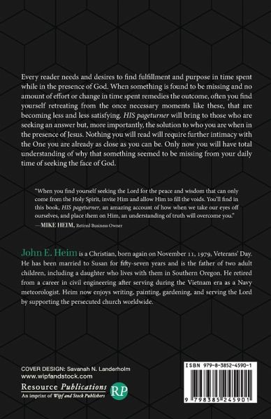 Every reader needs and desires to find fulfillment and purpose in time spent while in the presence of God. When something is found to be missing and no amount of effort or change in time spent remedies the outcome, often you find yourself retreating from the once necessary moments like these, that are becoming less and less satisfying. HIS pageturner will bring to those who are seeking an answer but, more importantly, the solution to who you are when in the presence of Jesus. Nothing you will read will require further intimacy with the One you are already as close as you can be. Only now you will have total understanding of why that something seemed to be missing from your daily time of seeking the face of God.