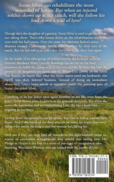 Scout Silver can rehabilitate the most wounded of horses. But when an injured soldier shows up at her ranch, will she follow his lead down a trail of love? Though she's the daughter of a general, Scout Silver is used to giving orders, not taking them. That's why horses thrive on the rehabilitation ranch she runs with her half-sisters. Over the years, her absentee father's many divorces created a patchwork family, held together by their love of the ranch. But his last will is an order that threatens to rip their lives apart. As the leader of an elite group of soldiers run by the brilliant tactician General Abraham Silver, Lincoln Rawlings has set out on his final mission-to fulfill the dying wish of his commander by ensuring that the general's six daughters are taken care of. When Linc arrives on the Silver Star Ranch, he learns that what the Silver sisters need are husbands, else they'll lose their beloved business. Instead of doing an immediate about-face, Linc's heart stands at attention under the assessing gaze of Scout, the eldest Silver. Unwilling to let her father once again interfere in her life, even from the grave, Scout has no plans to give in to the general's demands. But when she meets the handsome and accommodating Linc, she has a hard time reigning in her heart. Letting down the general is not an option, but Linc is hiding a secret from Scout. And if she learns of the deep wounds he bears, he might lose everything-the ranch, his honor, and the woman he's falling for. Find out if love can truly heal all wounds in this light-hearted, sweet romance of convenient arrangements that unfold into lasting love. His Pledge to Honor is the first in a series of marriage of convenience tales featuring Wounded Warriors who are healed with the power of love.