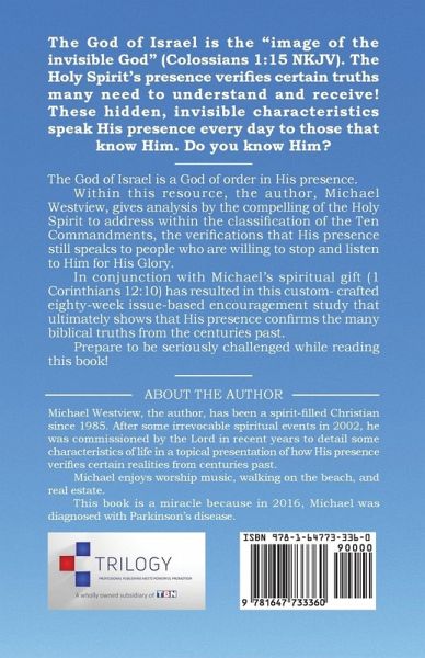 The God of Israel is the "image of the invisible God" (Colossians 1:15 NKJV). The Holy Spirit's presence verifies certain truths many need to understand and receive! These hidden, invisible characteristics speak His presence every day to those that know Him. Do you know Him? The God of Israel is a God of order in His presence. Within this resource, the author, Michael Westview, gives analysis by the compelling of the Holy Spirit to address within the classification of the Ten Commandments, the verifications that His presence still speaks to people who are willing to stop and listen to Him for His Glory. In conjunction with Michael's spiritual gift (1 Corinthians 12:10) has resulted in this custom- crafted eighty-week issue-based encouragement study that ultimately shows that His presence confirms the many biblical truths from the centuries past. Prepare to be seriously challenged while reading this book!