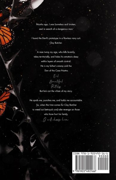 Months ago, I was homeless and broken, and in search of a dangerous man. I found the Devil's prototype in a flawless navy suit. Clay Butcher. A man twice my age, who kills brutally, takes territorially, and hides his emotions deep within layers of smooth control. He is my father's enemy and the Don of the Cosa Nostra. Evil.Beautiful.Ruthless. But he's not the villain of my story. He spoils me, punishes me, and holds me accountable. So, when the time comes for Clay Butcher to weed out betrayals and take revenge on those who have hurt his family, I will choose him. I will always choose him.