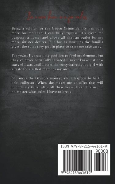 I've never been one for rules. Being a soldier for the Gruco Crime Family has done more for me than I can fully express. It's given me purpose, a home, and above all else, an outlet for my more sinister desires. But for as much as the familia gives, the rules they put in place to tame me take away. For years, I've used my position to feed my demons, but they've never been fully satiated. I never knew just how starved I was until I meet the curly-haired good girl with a taste for sin that matches my own. She owes the Gruco's money, and I happen to be the debt collector. When she makes me an offer that will quench my thirst after all these years, I can't refuse… no matter what rules I have to break. *Warning: this book contains sadomasochism, including pain play and other dark situations that may be disturbing for some. Reader discretion is advised.*