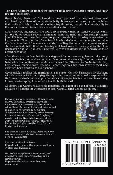 The Lord Vampire of Rochester doesn't do a favor without a price. And now it's time to collect. Gavin Drake, Baron of Darkwood is being pestered by nosy neighbors and matchmaking mothers of the mortal nobility. To escape their scrutiny, he concludes that it's time to take a wife. After witnessing the young vampire Lenore's loyalty to the Lord of London, he decides she is sufficient for the role. After surviving kidnapping and abuse from rogue vampires, Lenore Graves wants to help other women recover from their inner wounds. She befriends physician John Elliotson and uses her vampire powers to aid him in using mesmerism on his patients. When the Lord Vampire of London declares that Lenore is the price the Lord Vampire of Rochester demands for aiding him in battle the previous year, she is terrified. Will all of her healing and hard work be destroyed by Ruthless Rochester? And yet, she can't suppress stirrings of desire at the memory of their potent encounter. After Gavin assures her that the marriage will be in name only, Lenore reluctantly accepts Gavin's proposal rather than face potential animosity from her new lord. Determined to continue her work, she invites John Elliotson to Rochester. As they help women recover from traumas, Lenore explores her own inner turmoil and examines her attraction to her husband. Gavin quickly realizes his marriage is a mistake. His new baroness's involvement with the mesmerist is damaging his reputation among mortals and vampires alike. He knows he should put a stop to Lenore's antics- yet her tender heart is warming his own and tempting him to make her his bride in truth. As Lenore and Gavin's relationship blossoms, the leader of a gang of rogue vampires embarks on a quest for vengeance against Gavin… using Lenore as his key.