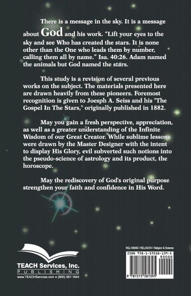 There is a message in the sky. It is a message about God and his work. "Lift your eyes to the sky and see Who has created the stars. It is none other than the One who leads them by number, calling them all by name." Isa. 40:26. Adam named the animals but God named the stars. This study is a revision of several previous works on the subject. The materials presented here are drawn heavily from these pioneers. Foremost recognition is given to Joesph A. Seiss and his "The Gospel In The Stars," originally published in 1882. May you gain a fresh perspective, appreciation, as well as a greater understanding of the Infinite Wisdom of our Great Creator. While sublime lessons were drawn by the Master Designer with the intent to display His Glory, evil subverted such notions into the pseudo-science of astrology and its product, the horoscope. May the rediscovery of God's original purpose strengthen your faith and confidence in His Word.