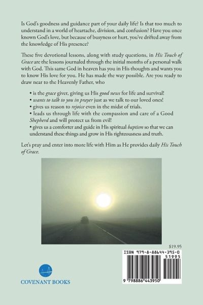 Is God's goodness and guidance part of your daily life? Is that too much to understand in a world of heartache, division, and confusion? Have you once known God's love, but because of busyness or hurt, you've drifted away from the knowledge of His presence? These five devotional lessons, along with study questions, in His Touch of Grace are the lessons journaled through the initial months of a personal walk with God. This same God in heaven has you in His thoughts and wants you to know His love for you. He has made the way possible. Are you ready to draw near to the Heavenly Father, who is the grace giver, giving us His good news for life and survival! wants to talk to you in prayer just as we talk to our loved ones! gives us reason to rejoice even in the midst of trials. leads us through life with the compassion and care of a Good Shepherd and will protect us from evil! gives us a comforter and guide in His spiritual baptism so that we can understand these things and grow in His righteousness and truth. Let's pray and enter into more life with Him as He provides daily His Touch of Grace.
