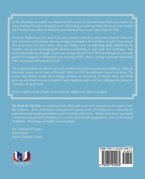 As the wheelchair-accessible van climbs the hill toward 12-year-old Annie Behr's new home, she senses that her life will be changed forever. This feeling is confirmed when she sees the once elegant old Victorian house that her family has just inherited from Great Uncle Truth B. Told. From the beginning to the end of the story, puzzles, mysteries, and secrets abound with every twist and turn as this fantasy adventure brings the kingdom of God down to earth. Even though they don't know it at first, Annie, Alan, and Teddy-who are differently abled children of two families-are on an encouraging life adventure of learning to cope with their challenges. They meet God on the way, through a mysterious stranger named Truth. This mystifying man eventually guides the youngsters in finding the true meaning of life-that is, having a personal relationship with a loving and compassionate God. This inspirational novel is the first of a series in which the characters grow into adulthood. Although this book centers on the town of Peaceful Valley in 1957, the adventure doesn't stop there. The reader visits fantasy worlds where strange wonders are discovered. As Annie, Alan, and Teddy grow up, the books increase in maturity and complexity and so do the challenges the characters encounter along the way. As you read this book, prepare to be surprised, enlightened, and encouraged.