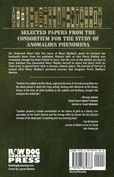 His Unburned Heart, tells the story of Mary Shelley's quest to retrieve her husband's heart from his publisher. History tells us that Percy Shelley was cremated, though his heart failed to burn, but the rest of the details are lost to time. Sandner has channeled Mary Shelley herself to share the story with us. That story is paired here with a second, related, piece. The Journal of Sorrow is named after Mary Shelley's personal journal, and imagines Percy Shelley's demise. "Sandner presents a tender examination on the nature of grief as a literary icon speculates on her lover's demise and the strange effort to recover the last physical remnant of her dead poet. Compelling and very moving prose." --Tim McGregor, author of Wasps in the Ice Cream and Eynhallow ¿¿"A valentine's gift of the most morbid kind, Sandner's electric imagination shockingly brings back to life the woman who many would say founded science fiction and fantasy with her Frankenstein. Here we find the author turned main character, haunted by the love of her life in the most artfully gothic of ways. Sandner has crafted a terrific tribute, capturing the voice of not only young Mary but the whole period in which she lived, artfully winking with references to the literary history of the time, all while building on the sublime and terrifying concepts that underpin this artful tale. Only a writer, theorist and researcher like David Sandner could pull this conceit off so well, balancing tribute with tension, and Frankenstein's many fans and literary scholars alike will find this treatment a fascinating contribution to the legacy of Mary and her hideous progeny. Shelley lives! And His Unburned Heart pulses with dread and delight!" -- Michael Arnzen, Bram Stoker Award winning author of Grave Markings and 100 Jolts
