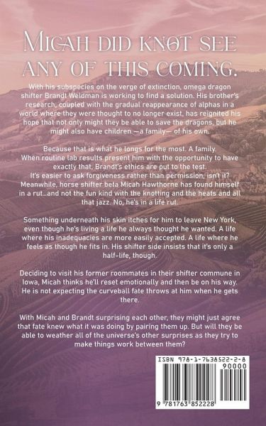 Micah did knot see any of this coming... With his subspecies on the verge of extinction, omega dragon shifter Brandt Weldman is working to find a solution. His brother's research, coupled with the gradual reappearance of alphas in a world where they were thought to no longer exist, has reignited his hope that not only might they be able to save the dragons, but he might also have children -a family- of his own. Because that is what he longs for the most. A family. When routine lab results present him with the opportunity to have exactly that, Brandt's ethics are put to the test. It's easier to ask forgiveness rather than permission, isn't it? Meanwhile, horse shifter beta Micah Hawthorne has found himself in a rut...and not the fun kind with the knotting and the heats and all that jazz. No, he's in a life rut. Something underneath his skin itches for him to leave New York, even though he's living a life he always thought he wanted. A life where his inadequacies are more easily accepted. A life where he feels as though he fits in. His shifter side insists that it's only a half-life, though. Deciding to visit his former roommates in their shifter commune in Iowa, Micah thinks he'll reset emotionally and then be on his way. He is not expecting the curveball fate throws at him when he gets there. With Micah and Brandt surprising each other, they might just agree that fate knew what it was doing by pairing them up. But will they be able to weather all of the universe's other surprises as they try to make things work between them? CW: While this is a predominately sweet & steamy mpreg Omegaverse romance with low relationship angst and zero miscommunication between the MCs once they meet, His Unicorn Alpha does cover some potentially upsetting topics and themes with hurt/comfort elements and some angst from external conflicts. These include: infertility, pregnancy complications, premature birth, gender/breed disappointment, a postnatal depressive episode, body issues/self-confidence, size-related insecurity/anxiety (an MC with a microp3nis), and implantation of embryos/conception without the donor's explicit consent.